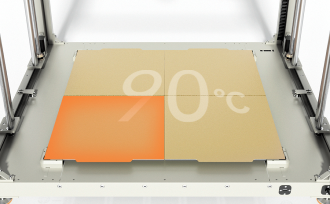 The heated bed consists of four independent (410*410mm) PEI magnetic high-temperature platforms with a maximum temperature of 100°C.