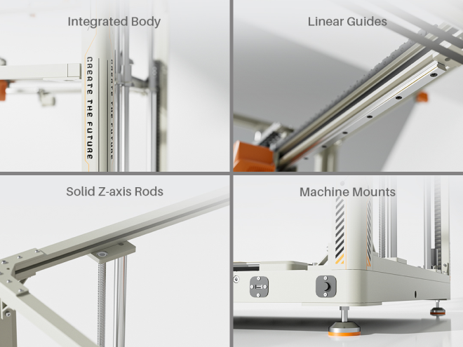 The integrated body design combines elegance and durability, making it ideal for professional 3D printing. The Xaxis and Y-axis linear guides enhance printing stability and extend the machine's lifespan.