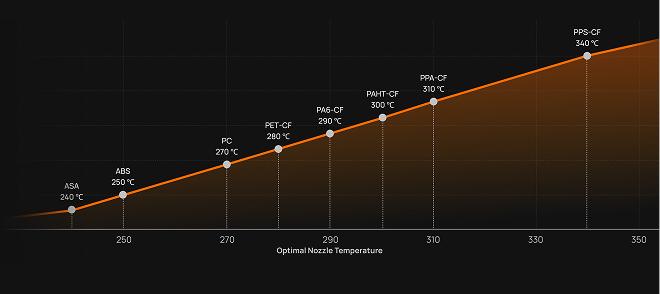 Unlock the full performance of high-temperature materials with a 350 °C (662 °F) nozzle. Achieve superior layer bonding on demanding filaments like PPA-CF, PPS, and PPS-CF, producing stronger, more reliable parts.