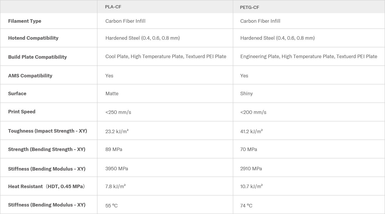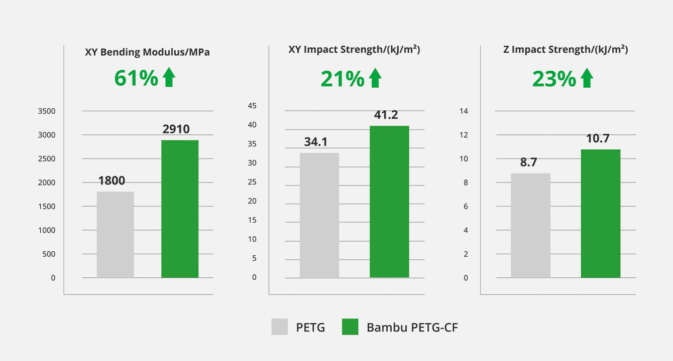 The addition of carbon fiber significantly enhances the XY strength of PETG without sacrificing layer bonding.