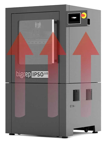 With a build chamber of 400 mm x 600 mm x 440 m (build volume of 105 liters) IPSO hits a sweet spot between a desktop and a large-scale 3D printer, perfect for many tooling applications. Thanks to its made-to-last industrial components and stepper motors with encoders, IPSO 105 achieves the level of accuracy and repeatability you expect in an industrial machine.