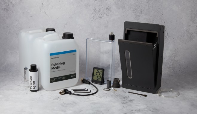 A drop-in upgrade for the Fuse Blast to get a smooth, semi-gloss, and dye-ready finish for SLS parts.