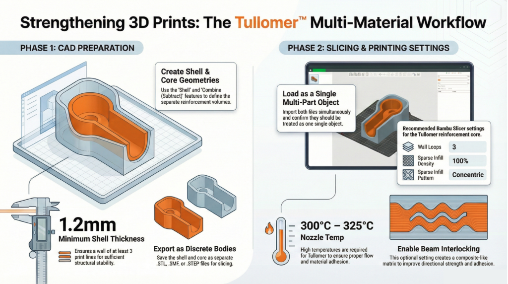 Material pairing determines both printability and long-term mechanical performance. The reinforcement material must bond reliably with the shell while maintaining distinct mechanical properties at the interface.