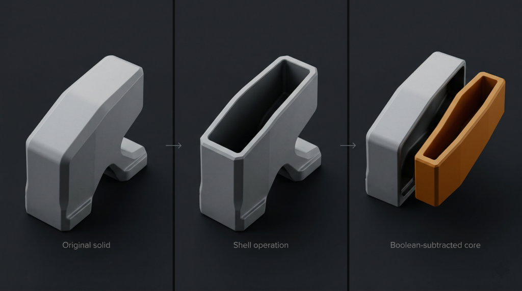 With your shell geometry defined, duplicate that shelled body and perform a boolean subtraction: subtract the shelled copy from your original solid. The resulting geometry is your core, the precise negative space that will be filled with high-performance reinforcement material. Export both bodies as separate STL, 3MF, or STEP files.