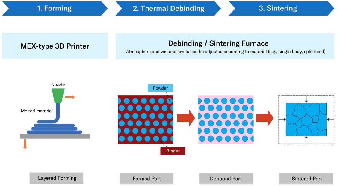 Using MEX-type 3D printers followed by debinding and sintering, users can produce high-precision metal or ceramic parts.