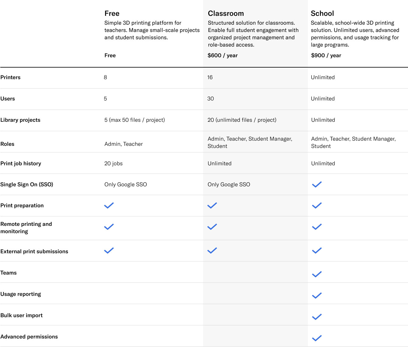 Digital Factory provides flexible plans tailored to educators at every level, from individual teachers to entire schools and districts. Whether you're introducing 3D printing to your classroom or overseeing a large-scale program, its tiered structure ensures you have the right tools to optimize workflows, manage projects, and foster student creativity. With scalable features such as expanded printer connections, increased storage, customizable user roles, and advanced reporting, schools can effortlessly grow their 3D printing programs while maintaining efficiency and control.